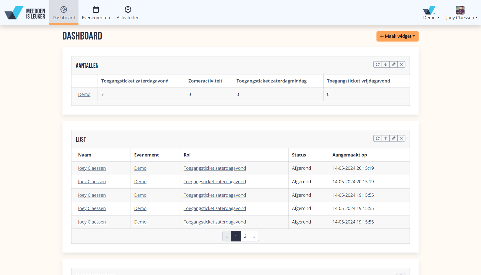 Je kunt zelf widgets toevoegen zoals bijvoorbeeld een lijst of het aantal inschrijvingen, het programma voor een specifieke groep, een overzicht van verjaardagen en nog veel meer.
